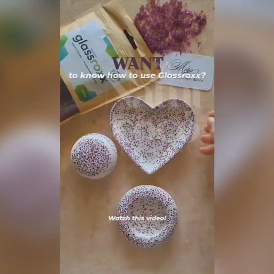 Decoración original y sostenible para tus figuras de resina. Recomendado por JESMONITE®, GlassRoxx se elabora íntegramente con vidrio reciclado, procedente de contenedores de reciclaje. Son tintados con pigmentos orgánicos a base de agua.