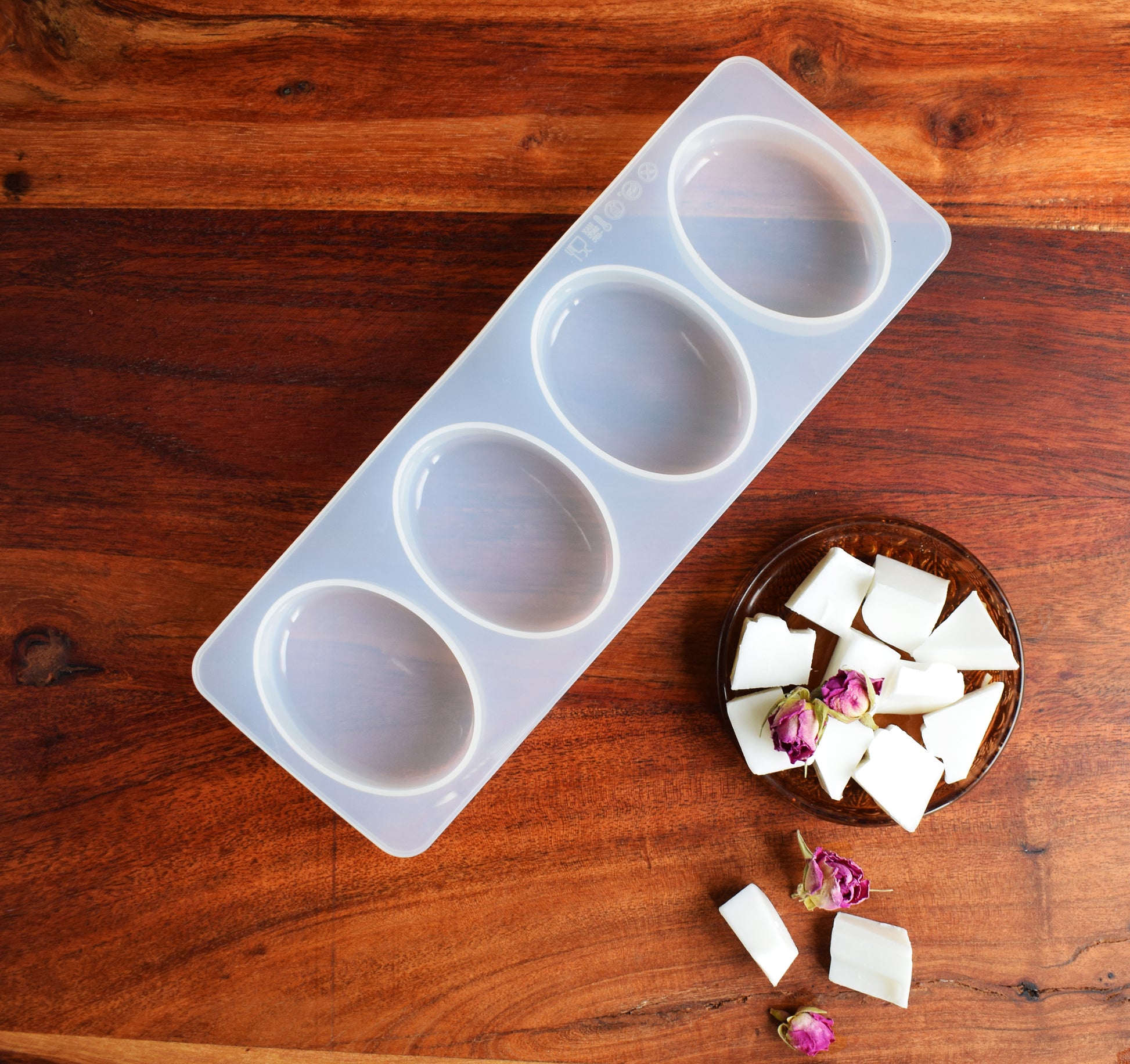 Molde para elaborar 4 jabones ovalados. Fabricado con silicona de alta calidad para jabones con resultados profesionales. Material flexible, desmoldado fácil y eficaz.