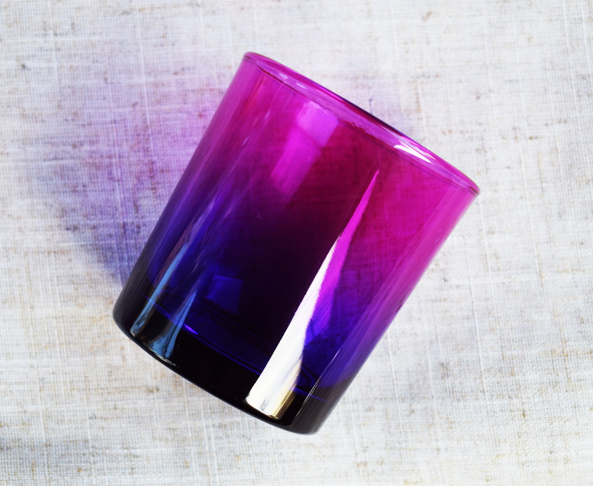 Vaso de vidrio apto para velas. Cristal grueso. Color / estilo rosa / violeta.